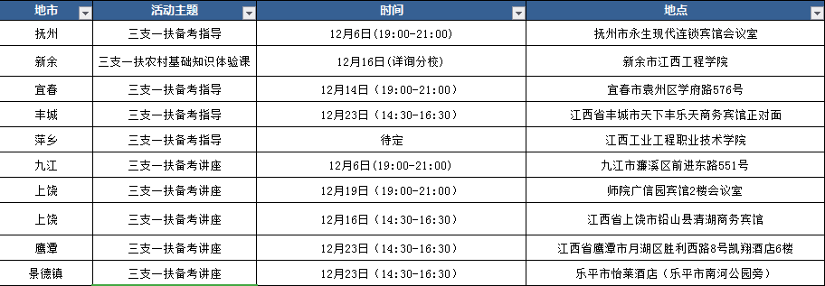关注“jx-szyf”微信公众号,获取三支一扶资讯 江西三支一扶各地市线下备考系列免费讲座来啦~~ 这次参与的地市有:抚州、新余、宜春、丰城、萍乡、九江、上饶、鹰潭、景德镇 具体讲座时间请看下面的图片。 有空的小伙伴可以填写正确信息预约,我们会安排座位,并在讲座开始前短信提醒哦~ ~