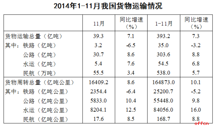 中公解读:这篇表格型材料大标题是2014年1~11月我国货物运输情况,明确时间;列标题为货物运输总量和货物周转总量以及具体的分类(铁路、公路、水运、民航),其中注意民航的货物运输总量单位是“万吨”,而其他的是“亿吨”。行标题是11月和1~11月的数值及同比增速。看问题,时间2013年1~10月,2013年为基期,1~10月需要1~11月减去11月,比较大小找出货物运输总量最大的领域。那么这里就需要注意上面强调过的单位问题。