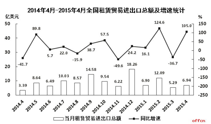问题:2014年5月~2015年4月间,全国租赁贸易进出口总额及同比增速均高于上月的月份有几个( )