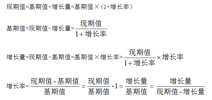 (1)单一数据问题:已知某个统计指标的现期值、基期值、增长量、增长率的一个或者多个,求这个统计指标的现期值、基期值、增长量、增长率问题