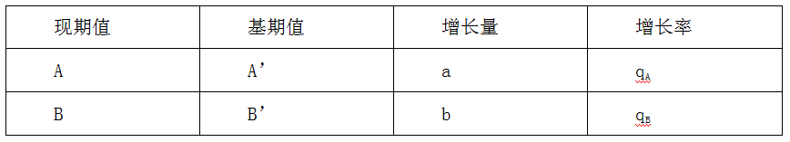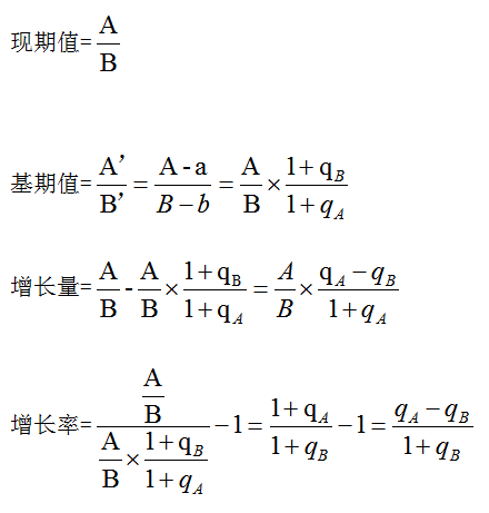 两数之比的现期值、基期值、增长量、增长率分别为: